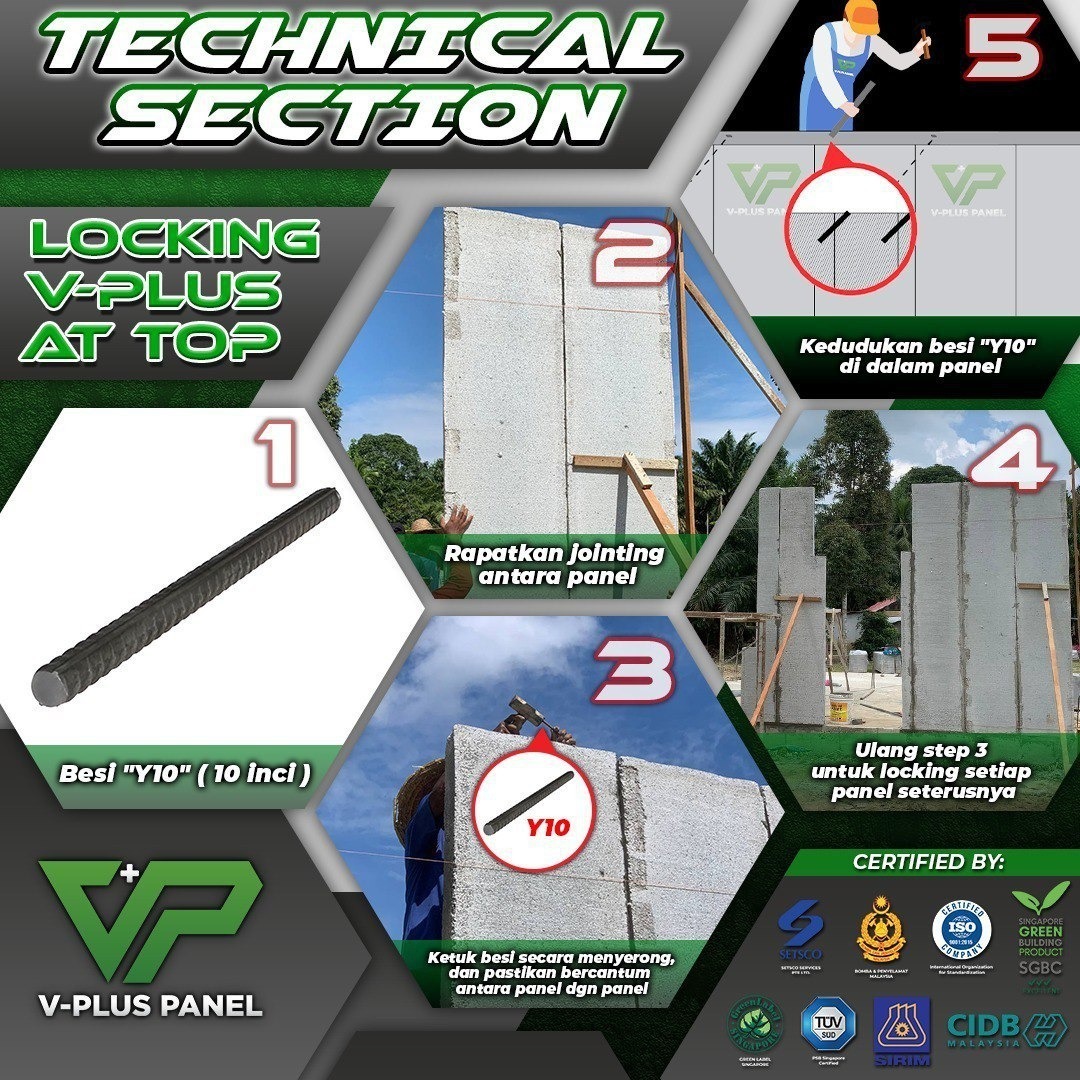 Sebagai langkah akhir, simen adhesive (simen gam) diaplikasikan pada setiap sambungan Big Block. Penggunaan simen gam ini memastikan lekatan yang lebih kuat antara blok, meningkatkan ketahanan sambungan dan mengurangkan risiko rekahan halus. Secara keseluruhan, kaedah locking IBS V-PLUS Big Block ini memberikan sistem pemasangan yang lebih selamat, stabil dan berkualiti tinggi, selari dengan keperluan teknikal pembinaan rumah kediaman moden.