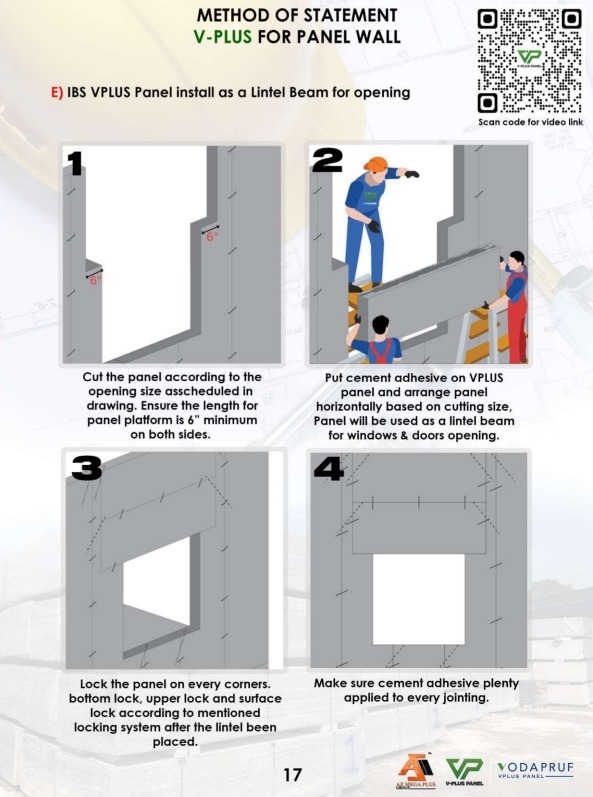 Pemasangan lintel beam merupakan salah satu kerja penting dalam pembinaan dinding menggunakan sistem IBS V-PLUS, terutamanya pada bahagian atas bukaan pintu dan tingkap. Lintel beam berfungsi untuk menampung beban dinding di atas bukaan tersebut dan memindahkan beban ke struktur sisi seperti panel atau tiang. Oleh itu, pemasangan yang betul amat penting bagi memastikan kestabilan dan keselamatan struktur bangunan.