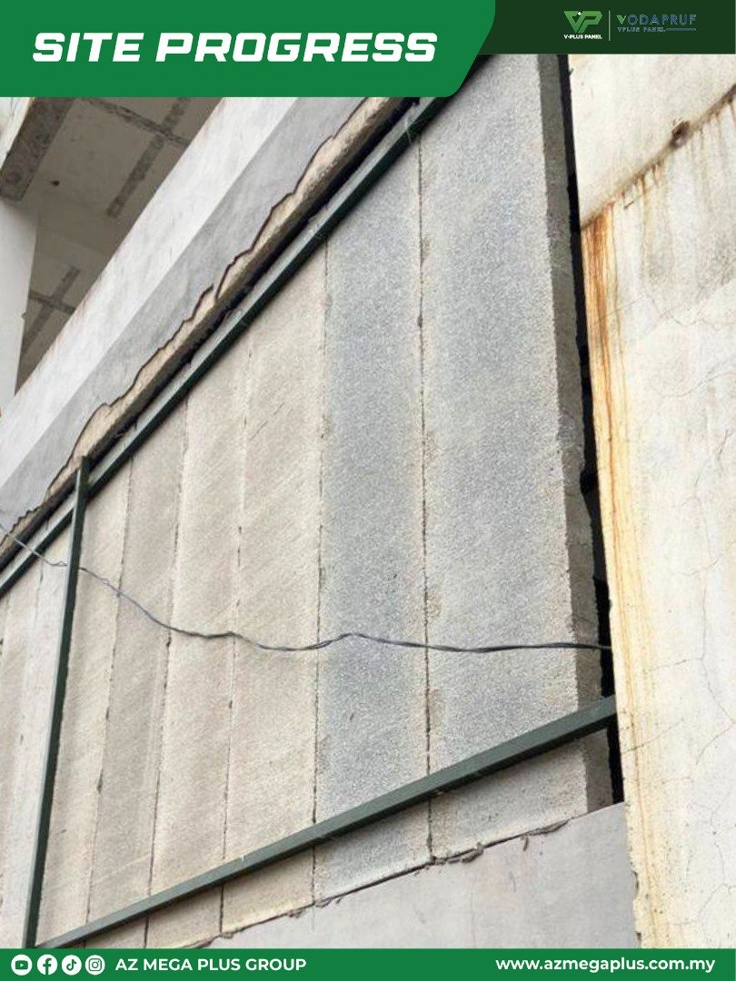 Pemilihan IBS V-PLUS Panel membantu mempercepatkan proses pemasangan dinding di tapak projek. Panel pra-tuang bersaiz standard (10’ x 2’) membolehkan kawasan dinding yang luas dipasang dengan lebih pantas, mengurangkan jumlah sambungan serta menghasilkan permukaan dinding yang lebih rata dan kemas. Kaedah ini amat sesuai untuk pembinaan bangunan komersial seperti pasaraya yang memerlukan tempoh pembinaan yang singkat dan kawalan kualiti yang konsisten.