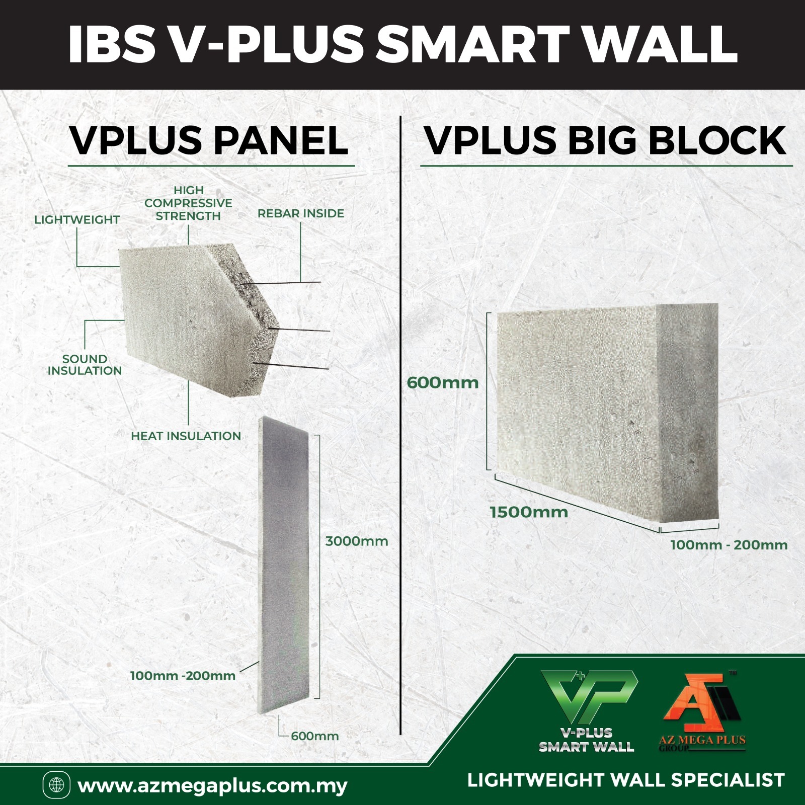 IBS V-PLUS Smart Wall terdiri daripada dua jenis utama iaitu V-PLUS Panel dan V-PLUS Big Block. V-PLUS Panel mempunyai saiz tinggi 3000mm, lebar 610mm dan ketebalan antara 100mm hingga 200mm. Saiz panel yang tinggi membolehkan pemasangan dinding dilakukan dengan lebih tersusun dan sekata. Ditambah pula dengan keperluan skim coat setebal 5mm sahaja, dinding yang terhasil menjadi lebih rata, licin dan kemas, sekali gus menyerlahkan kecantikan dalaman dan luaran rumah.